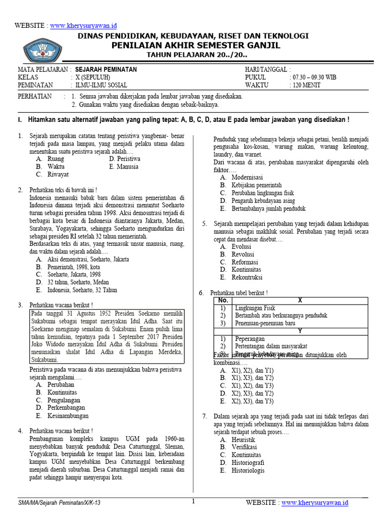 Penilaian Akhir Semester (PAS) menjadi gerbang penentu pemahaman siswa terhadap materi yang telah dipelajari selama satu semester. Bagi siswa Kelas X peminatan Sejarah, PAS semester 1 menyajikan tantangan tersendiri dalam mengukur kedalaman pengetahuan mereka tentang peristiwa-peristiwa penting di masa lalu dan bagaimana peristiwa tersebut membentuk dunia kita saat ini. Menghadapi momen krusial ini, persiapan yang matang adalah kunci. Salah satu cara efektif untuk mempersiapkan diri adalah dengan berlatih menggunakan soal-soal PAS dari tahun-tahun sebelumnya. Artikel ini akan memandu Anda secara rinci tentang cara mengunduh soal PAS Sejarah Peminatan Kelas X Semester 1, lengkap dengan tips dan trik untuk memaksimalkan manfaat dari latihan tersebut.