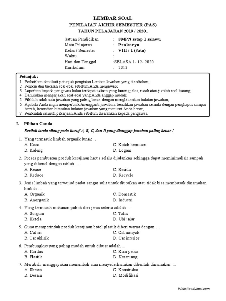 Penilaian Akhir Semester (PAS) Prakarya kelas 8 semester 1 merupakan momen penting bagi siswa untuk mengukur sejauh mana pemahaman mereka terhadap materi yang telah dipelajari selama satu semester. Mata pelajaran Prakarya sendiri dirancang untuk mengembangkan keterampilan praktis, kreativitas, dan pemahaman siswa terhadap berbagai aspek kerajinan, teknologi, rekayasa, kewirausahaan, dan budidaya. Mempersiapkan diri dengan baik untuk PAS Prakarya adalah kunci untuk meraih hasil yang optimal. Salah satu cara efektif untuk mempersiapkan diri adalah dengan mengunduh dan mengerjakan soal-soal PAS Prakarya kelas 8 semester 1 dari tahun-tahun sebelumnya atau dari sumber-sumber terpercaya.
